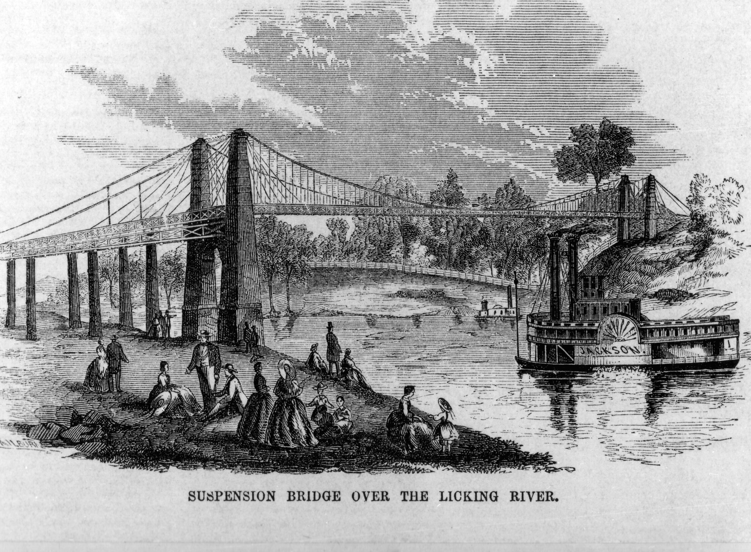 More than a decade before John A. Roebling’s graceful suspension bridge spanned the Ohio River between Cincinnati and Covington, a suspension bridge connected Covington and Newport. Located at East 4th Street in Covington, the Newport and Covington Suspension Bridge had a storied past.