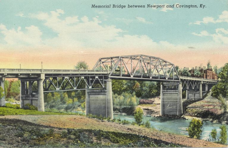 By August 1934, the contract for construction of the “substructure and concrete approaches” of the new bridge was awarded to the Temple Foundation of Cincinnati, and the steel superstructure to the R.C. Mahon Company of Detroit. The new bridge — to be named the World War Veterans’ Memorial Bridge — was to be owned by the state and totally free of tolls (“Cincinnatians Wins Contract for Bridge Across Licking,” “Cincinnati Enquirer,” August 29, 1934, p. 1; “Bridge Name,” “Cincinnati Enquirer,” April 27, 1936, p. 1).