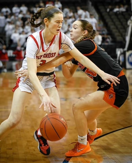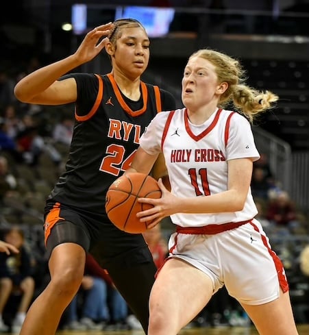 In a 9th Region girls semifinal game on Tuesday, Holy Cross got off to a shaky start and was behind by 16 points at halftime. When the players got together in the locker room, coach Ted Arlinghaus encouraged them to turn the page and strive for a happy ending in the second half.