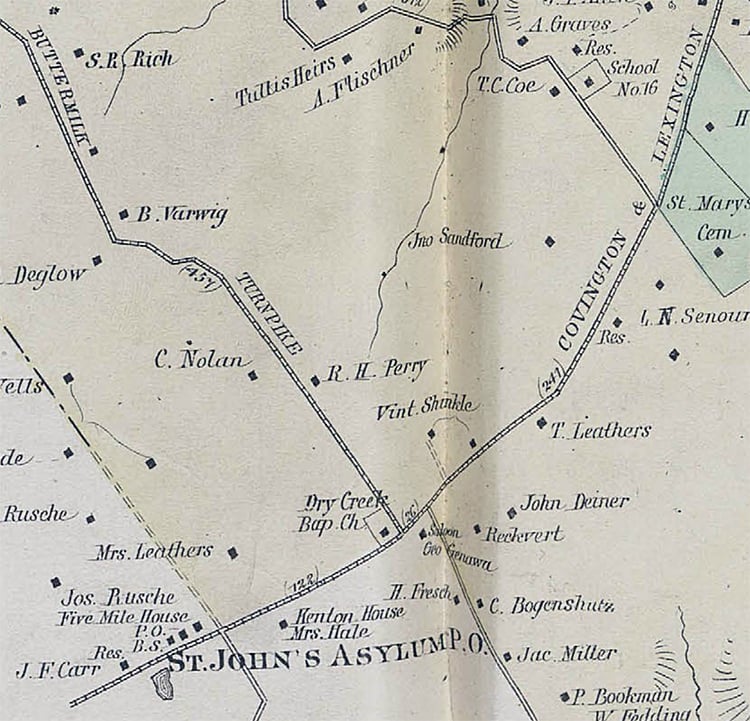 George Genoway, a French immigrant, had opened the saloon at what was then known as the Lexington Pike (now Dixie Highway) and Horse Branch Road (now Orphanage Road) in 1876. The area once was known as Rush’s Precinct or Magisterial District 1; now it’s part of South Fort Mitchell.