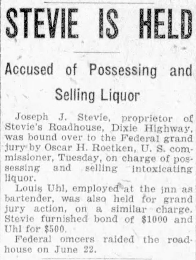 Prohibition agents caught up with Stevie and other Kenton County roadhouse operators in 1923. Additional holdups after the one in 1914 resulting in Stevie’s injury and the costs of evading Prohibition crackdowns likely led to Stevie leaving the hospitality business.